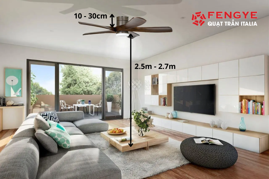 Độ cao trần: Với trần có độ cao từ 2.6 - 3m, bạn nên lựa chọn các loại quạt trần có cổ ngắn với chiều dài ti ngắn từ 10 - 30cm sao cho khoảng cách từ sàn đến quạt lớn hơn 2.5m - 2.7m đảm bảo an toàn.