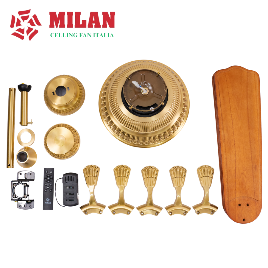 Thân quạt được làm bằng chất liệu đồng, màu đồng cổ Pháp và đúc tạo khắc vân hoa chi tiết tỉ mỉ, sang trọng. Mang đến không gian nội thất sang trọng, đẳng cấp, thể hiện gu thẩm mỹ tinh tế của gia chủ.
