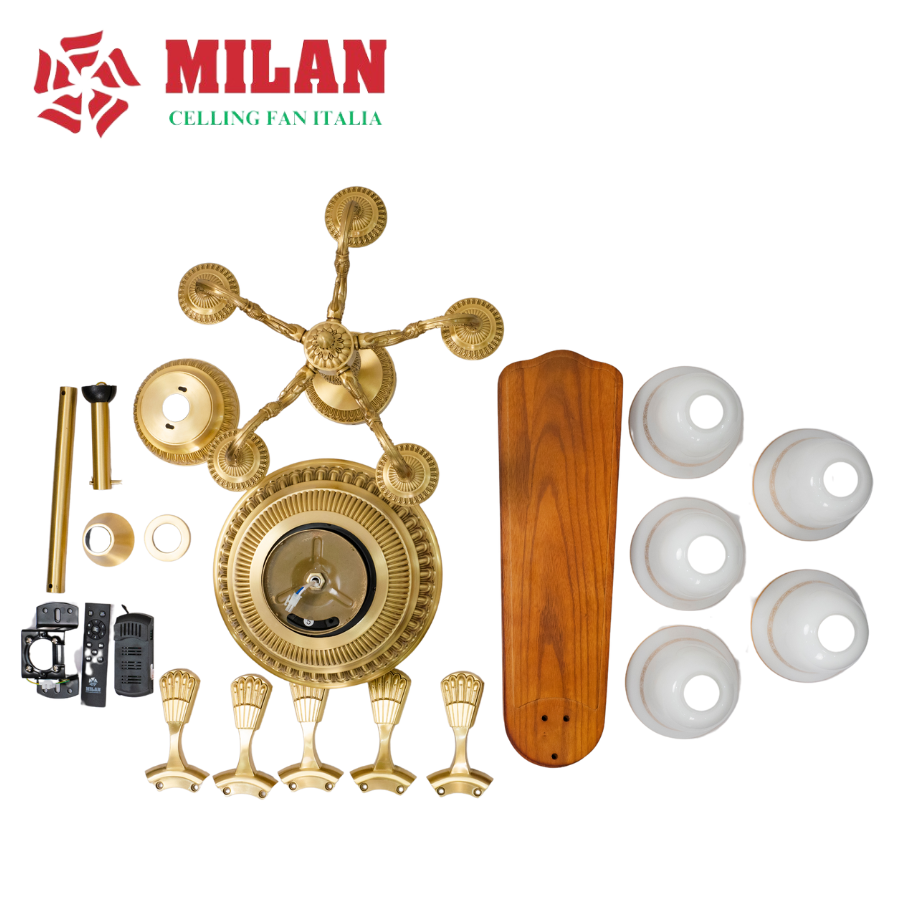 Sản phẩm quạt trần Italia FY586 – Quạt trần đèn chùm được thiết kế và sản xuất theo công nghệ hiện đại của Italia, chất lượng số 1 Châu Âu. Quạt trần cho người giàu FY586 có nhãn hiệu MILAN, được thiết kế gồm 5 cánh quạt. Mỗi cánh quạt đều được làm bằng chất liệu gỗ tự nhiên nguyên khối.