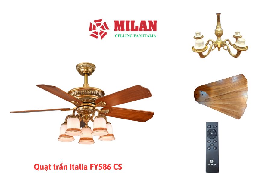 Sản phẩm được thiết kế gồm 5 cánh quạt, mỗi cánh quạt đều được làm bằng chất liệu gỗ tự nhiên nguyên khối. Quạt trần Italia FY586 là sản phẩm quạt trần cánh gỗ, quạt trần đèn chùm, nằm trong nhóm những sản phẩm quạt trần trang trí cao cấp. Đây là mẫu quạt trần đèn chùm đang được khách hàng hết mực ưa chuộng hiện nay.